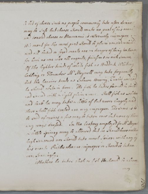 | Summary | Reply, 'For Mr Meynell'. Cullen gives directions, chiefly dietary, in regards to young Mr Meynell's 'delicate' constitution and stomach. |