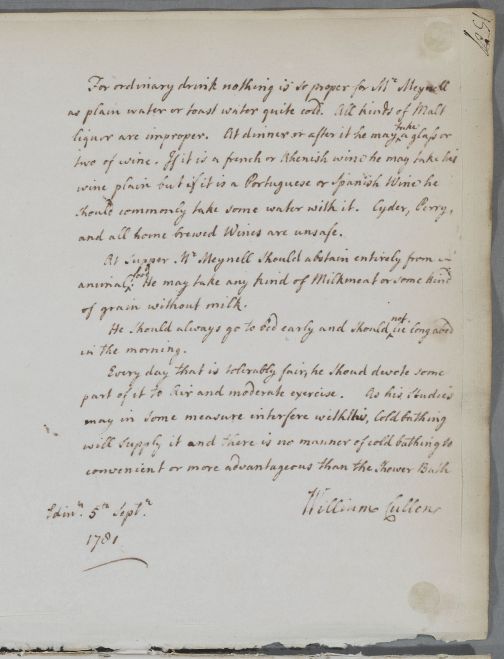 [ID:193] From: Dr William Cullen (Professor Cullen) / To: [ADDRESSEE UNKNOWN] / Regarding: Charles Meynell (Meynel) (Patient) / 5 September 1781 / (Outgoing)