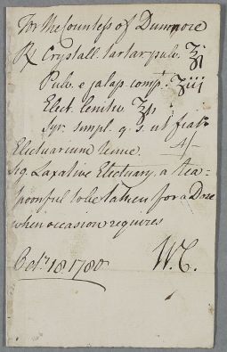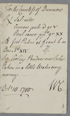 | Summary | Reply for the Countess of Dunmore. Brief notes of two recipes: a laxative and cooling powders. |
