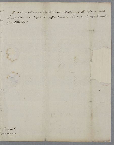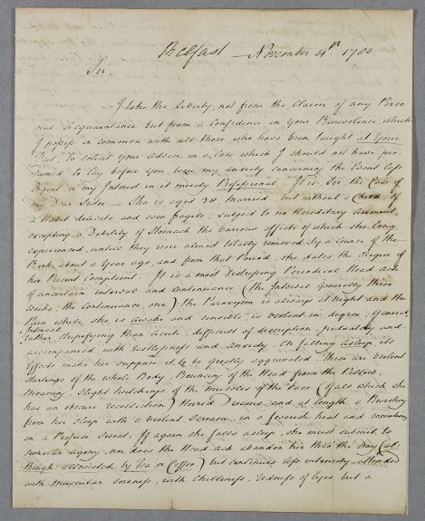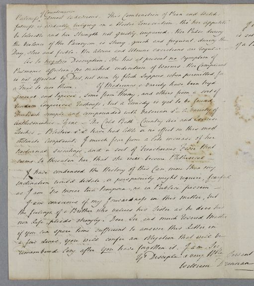 | Summary | Letter from William Drennan, a former student of Cullen's, concerning the case of his sister. Drennan fears a phthysis. |