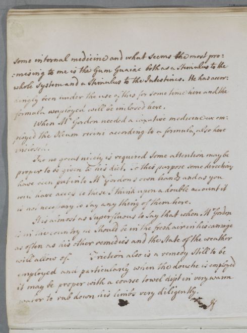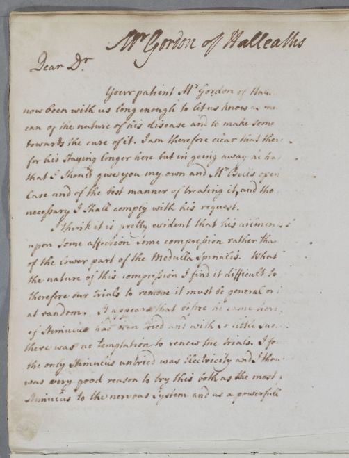 Reply to John Gilchrist, giving advice for Mr Gordon of Halleaths, who has visited Cullen and Bell in person. Cullen has also handed Gordon some directions in person. Gordon is suffering from compression of the spinal cord, with paralytic and continence problems. Cullen recommends the use of electricity, and mentions Jallabert's pioneering work in this field in Geneva.