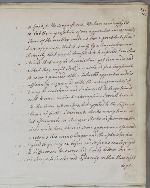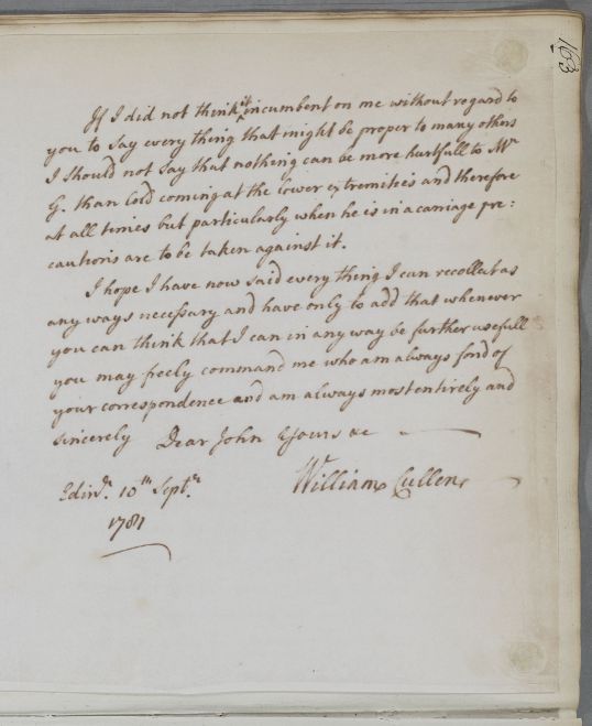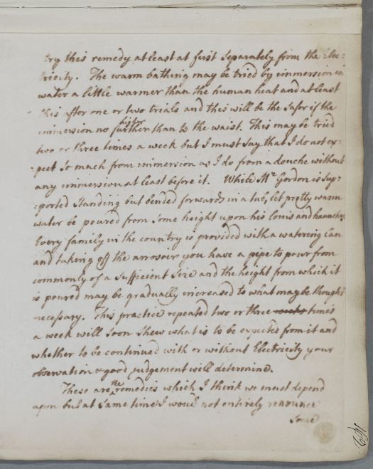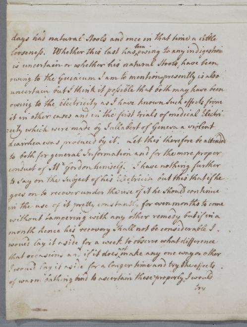 | Summary | Reply to John Gilchrist, giving advice for Mr Gordon of Halleaths, who has visited Cullen and Bell in person. Cullen has also handed Gordon some directions in person. Gordon is suffering from compression of the spinal cord, with paralytic and continence problems. Cullen recommends the use of electricity, and mentions Jallabert's pioneering work in this field in Geneva. |