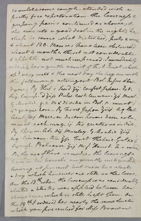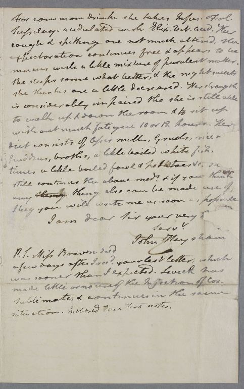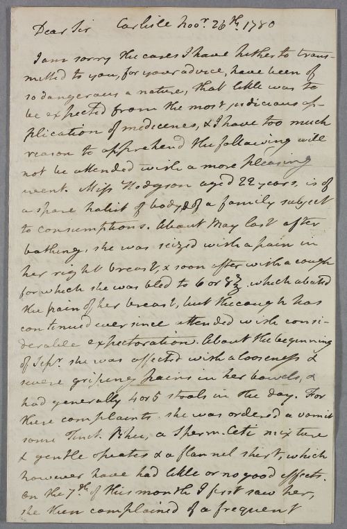 | Summary | Letter from John Heysham concerning the cases of Miss Hodgson, who is from a consumptive family, and has cough, expectoration, night sweats and looseness of bowels. He also reports briefly on Mr Leveck, who has not used the mercury injection and is unchanged, and on the death of Miss Brown. |