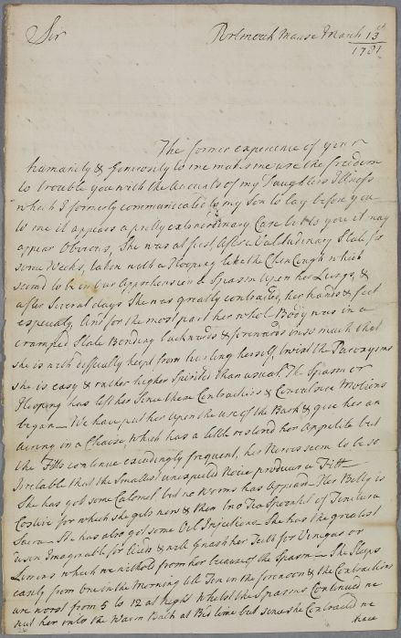 Letter from John Mudie at Portmoak Manse, concerning one of his daughters, who suffers from spasms that contract her body, and a cough. He mentions his sons, one of whom has been a student of Cullen, and another of whom is currently attending Edinburgh University.