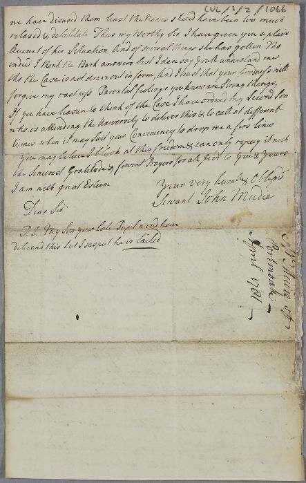 | Summary | Letter from John Mudie at Portmoak Manse, concerning one of his daughters, who suffers from spasms that contract her body, and a cough. He mentions his sons, one of whom has been a student of Cullen, and another of whom is currently attending Edinburgh University. |