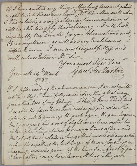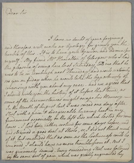 Letter from Gavin Fullarton, concerning his own case, as his friend 'Mr Hamilton of Glasgow' (Thomas or William?) is going to discuss it with Cullen when he visits him. He has a history of hæmorrhoids, and after a severe bout of costiveness, suffers from severe spasmodic pains in his rectum thought these are abating a little. He has consulted Stevenson, Dunlop and Hamilton, and undergone a range of treatments, from leeches to injections.