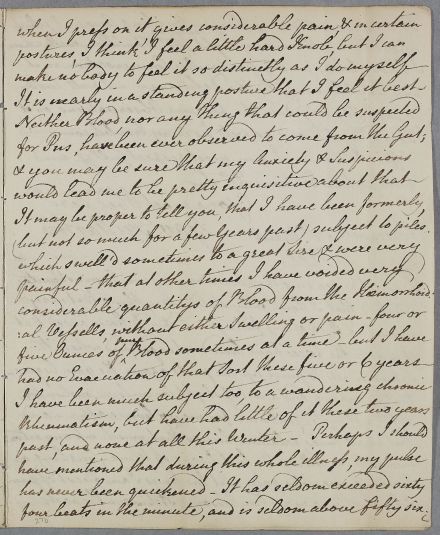 | Summary | Letter from Gavin Fullarton, concerning his own case, as his friend 'Mr Hamilton of Glasgow' (Thomas or William?) is going to discuss it with Cullen when he visits him. He has a history of hæmorrhoids, and after a severe bout of costiveness, suffers from severe spasmodic pains in his rectum thought these are abating a little. He has consulted Stevenson, Dunlop and Hamilton, and undergone a range of treatments, from leeches to injections. |
