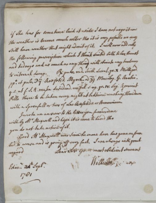 [ID:199] From: Dr William Cullen (Professor Cullen) / To: Mr William Ingham / Regarding: Mrs Stevenson (Stephenson) (Patient), Mr Maxwell (Patient) / 28 September 1781 / (Outgoing)
