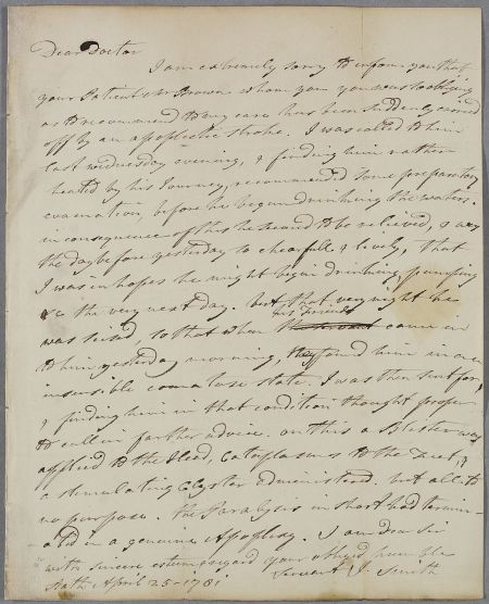 [ID:2002] From: Dr J Smith (of Bath) / To: Dr William Cullen (Professor Cullen) / Regarding: Mr Charles Brown (Patient) / 25 April 1781 / (Incoming)