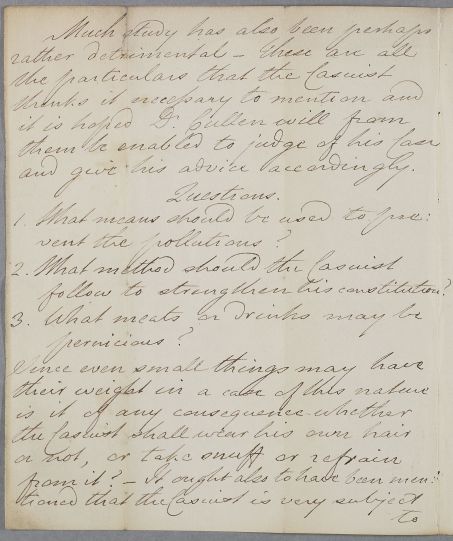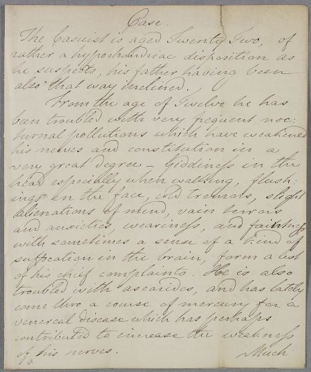 | Summary | Unsigned letter concerning the case of an unnamed male patient, named as Mr Pinkerton on the indexing on reverse. The young man, aged twenty-two, 'has been troubled with very frequent nocturnal pollutions' which, it was believed, weakened his nerves and contributed to his present list of complaints. |