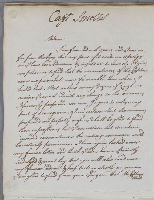 | Summary | Reply, 'Captain Smollet'; mentions a surgeon's report on the Captain's blood. |