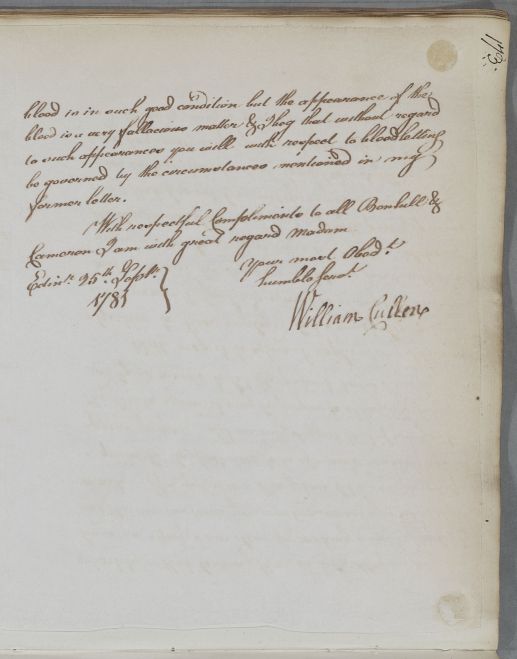 [ID:201] From: Dr William Cullen (Professor Cullen) / To: Mrs Smollet / Regarding: Captain Smollet (Patient) / 25 September 1781 / (Outgoing)