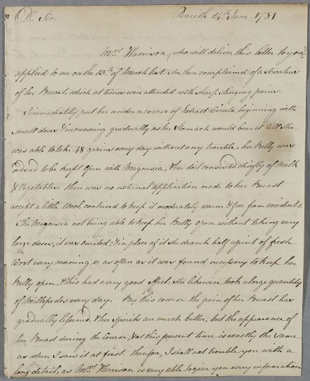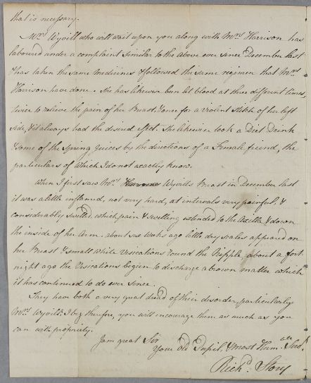 Letter from a former student of Cullen, Richard Story, concerning the cases of Mrs Harrison and Mrs Wyvill, who both have tumours in their breasts. Mrs Harrison, accompanied by Mrs Wyvill, hand-delivered the letter to Cullen (possibly at the University of Edinburgh) and told him further particulars of her case. Cullen replies in letters 151 and 152, after he has examined the two patients.