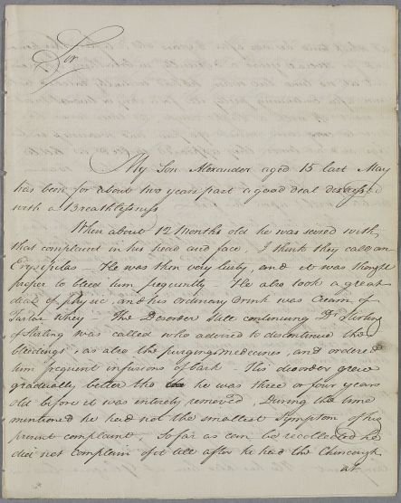 | Summary | Letter from Mr Cowan, concerning the case of his 15-year-old son Alexander, 'distressed with a Breathlessness'. |