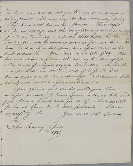 [ID:2023] From: Mr R Cowan / To: Dr William Cullen (Professor Cullen) / Regarding: Alexander Cowan (Patient) / 30 June 1781 / (Incoming)