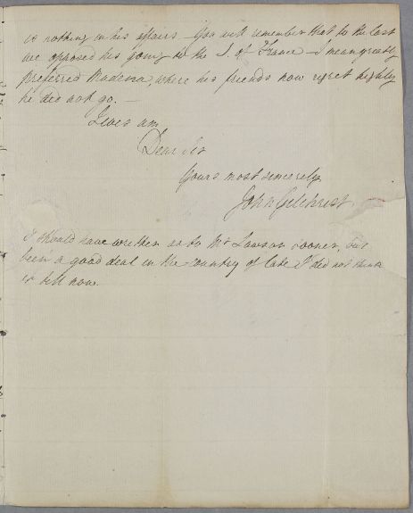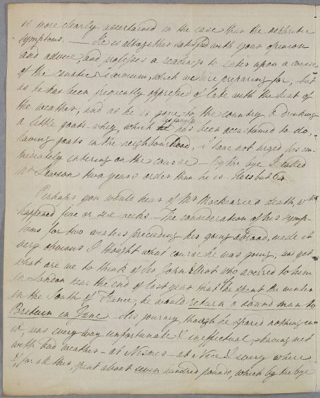 | Summary | Letter from John Gilchrist, concerning the case of Mr [Hugh] Lawson, who is 64. Lawson does not believe his kidneys to be the cause of his complaints, despite the state of his urine. Gilchrist also discusses the death of Mr [George] Mackenzie, who had been sent to the South of France, on the advice of Sir John Eliot, when his friends would have preferred him to go to Madeira. |