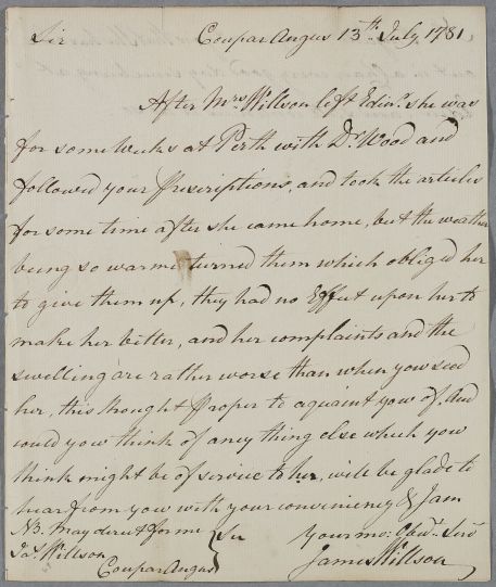 [ID:2028] From: James Wilson (Willson) / To: Dr William Cullen (Professor Cullen) / Regarding: Mrs Wilson (Willson) (Patient) / 13 July 1781 / (Incoming)