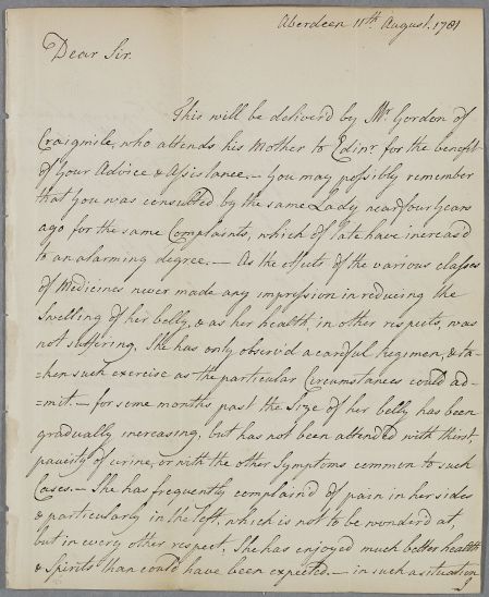 [ID:2045] From: Dr Thomas Livingston / To: Dr William Cullen (Professor Cullen) / Regarding: Mrs Isabel Gordon (Isabel McCulloch Gordon; of Greenlaw and later Craigmile) (Patient) / 11 August 1781 / (Incoming)
