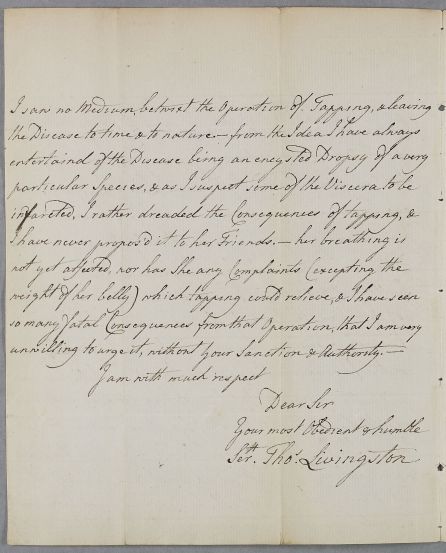 Case of Mrs Gordon of Craigmile who has a weak chest and whose fluid retention, in Cullen's opinion, does not warrant surgical tapping. |