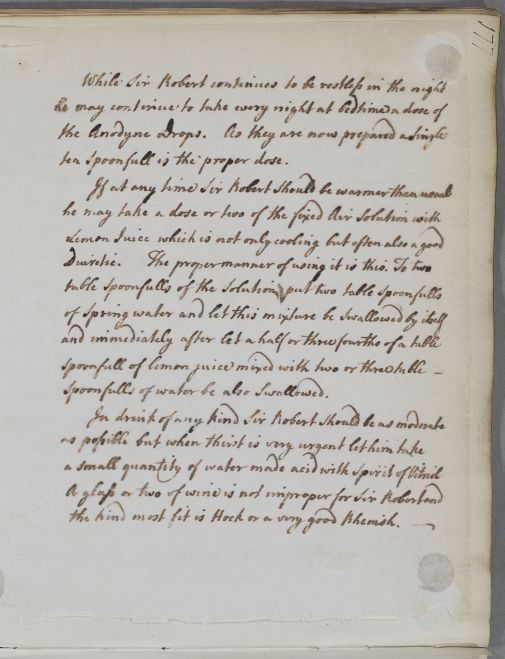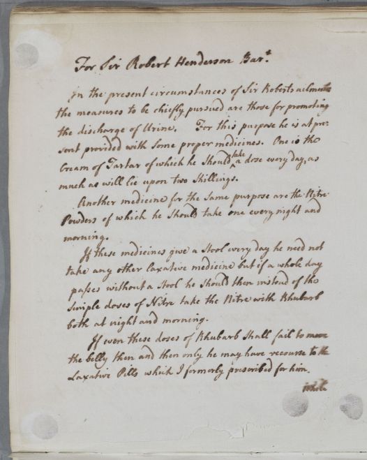 Reply, 'For Sir Robert Henderson'. Cullen gives directions for Sir Robert Henderson to take medicines apparently already given, for 'promoting the discharge of urine' and with related advice on food and drink The unnamed recipient is probably another of Henderson's physicians, possibly Dr. Matthew Dobson of Bath who wrote another letter in this case, or another of his (unnamed) physicians in Bath. But since Bath is not mentioned in the letter, the more generic unnamed'Sir Robert Henderson's physician' has been linked to the document.