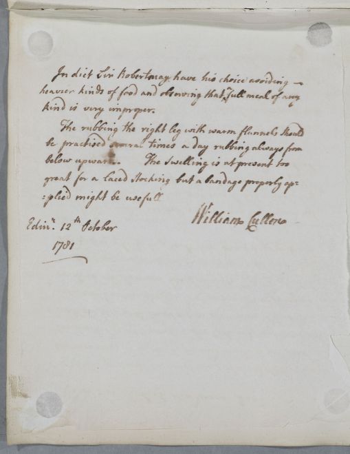 | Summary | Reply, 'For Sir Robert Henderson'. Cullen gives directions for Sir Robert Henderson to take medicines apparently already given, for 'promoting the discharge of urine' and with related advice on food and drink The unnamed recipient is probably another of Henderson's physicians, possibly Dr. Matthew Dobson of Bath who wrote another letter in this case, or another of his (unnamed) physicians in Bath. But since Bath is not mentioned in the letter, the more generic unnamed'Sir Robert Henderson's physician' has been linked to the document. |