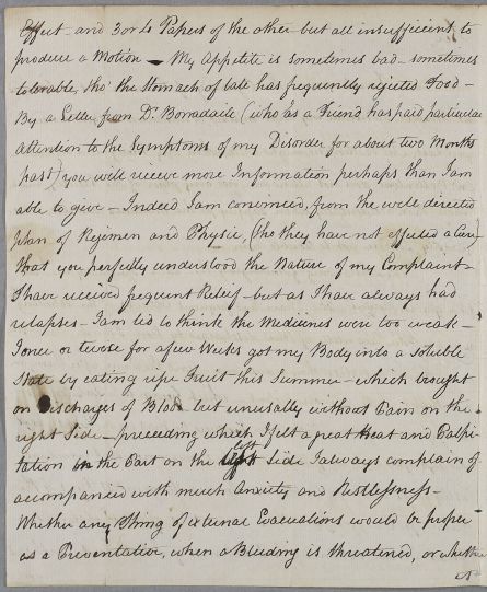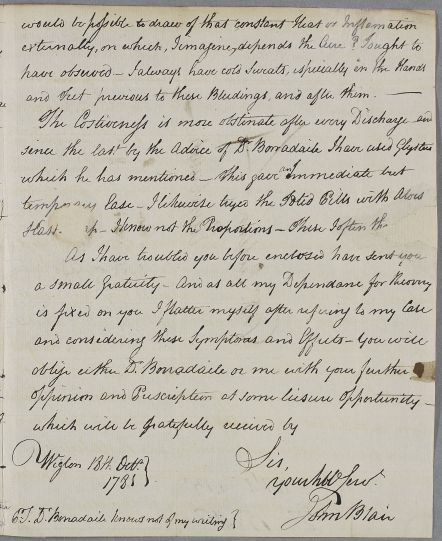 | Summary | Letter from John Blair, concerning his own case: he passes blood by stool. He mentions that 'You desired, in your last, Mr Ballentine might write, when any Thing new occurred- Mr. Ballentine does not attend me, nor any other of the Faculty'. However, 'By a Letter from Dr. Borradaile (who as a Friend has paid particular Attention to the Symptoms of my Disorder for about two Months past) you will receive more Information perhaps than I am able to give'. |