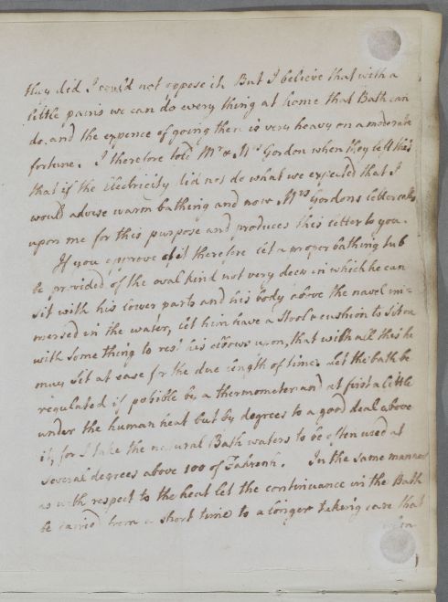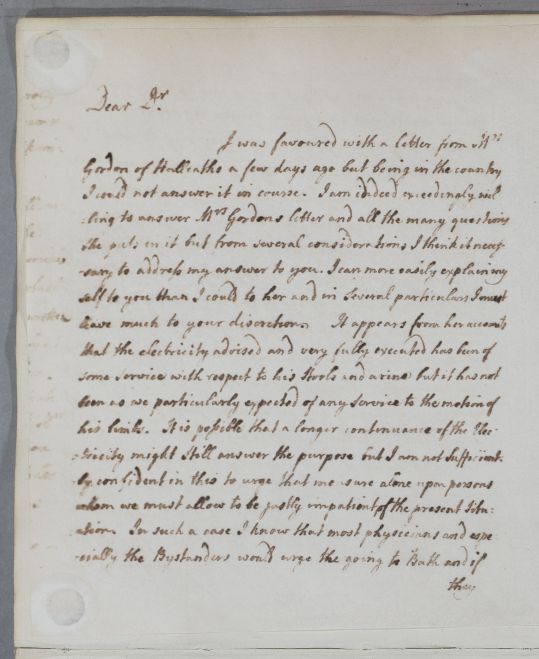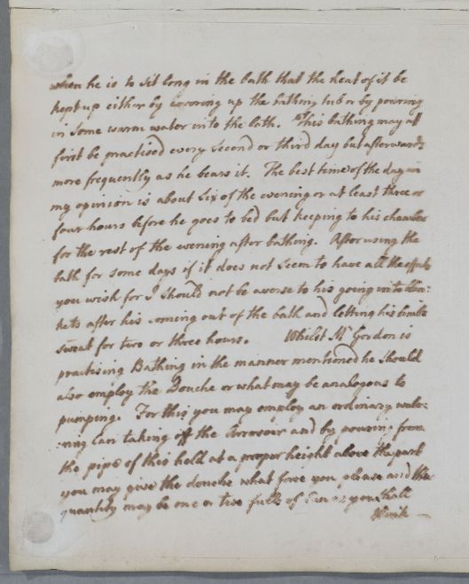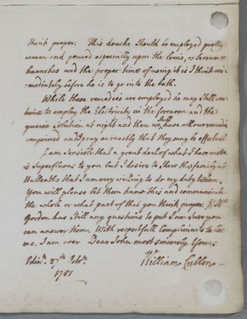 | Summary | Reply to John Gilchrist concerning Mr Gordon of Halleaths in response to his wife's letter. Cullen gives suggestions about bathing and comments on electrical treatment. |