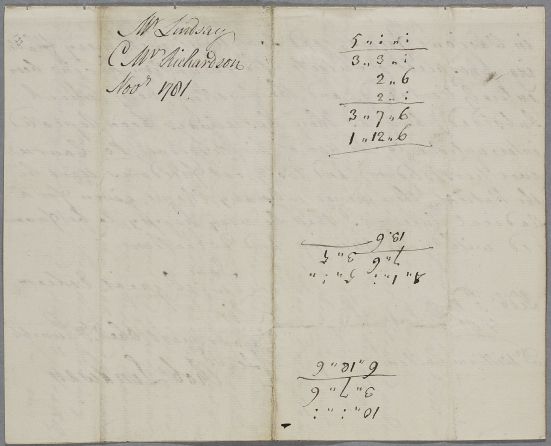 | Summary | Letter from Robert Lindsay, concerning the case of James Richardson's son. The letter's wrapper includes three sets of sums. These do not evidently form part of the original letter and have not been transcribed. |