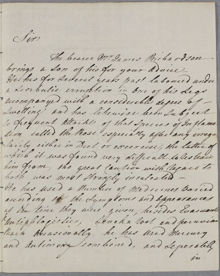 Case of the son of James Richardson who has a scorbutic eruption on his legs and a 'rose' (i.e. inflamed skin condition). |