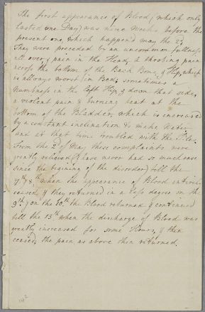 | Summary | Case note describing the correspondent's own case, with details from May of 1781 when they describe passing blood in their urine. Possibly incomplete. Unsigned and undated, but probably from some time in 1781. |