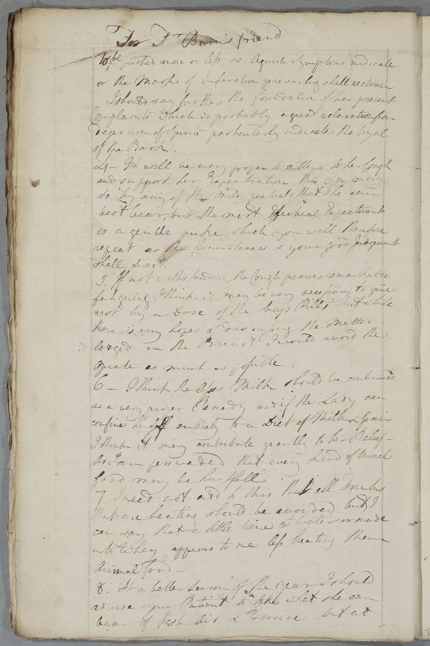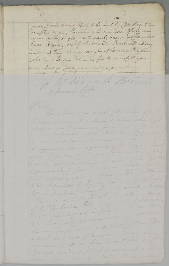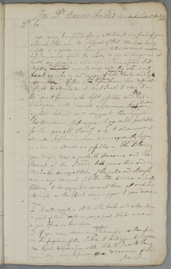 | Summary | Reply, 'For Dr Burn's Friend by his Letter 13th Decr 1764', discussing treatment of a lung condition in a young woman. Date is a guess based on the date of the incoming letter. |