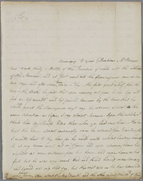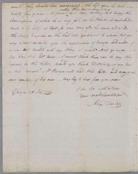 | Summary | Letter from Alexander Dunlop, concerning the case of James Brown, who 'has kept the house almost continually since he returned from Edinburgh', where he had consulted Cullen in person. He discusses his use of medicines and the semicupium, and asks on the advisability of electricity. Dunlop encloses Brown's letter to Cullen which is Doc 1D 2104. |
