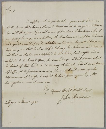 [ID:2112] From: Mr John Andrew / To: Dr William Cullen (Professor Cullen) / Regarding: Mr Livingstone (of Parkhall) (Patient) / 10 December 1781 / (Incoming)