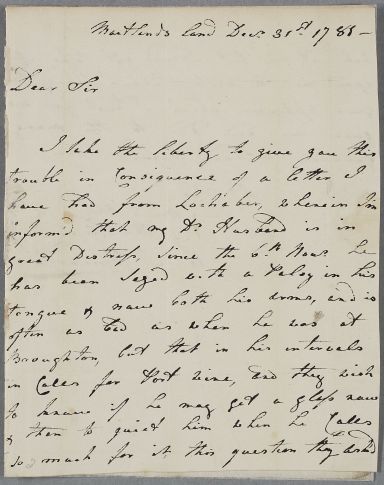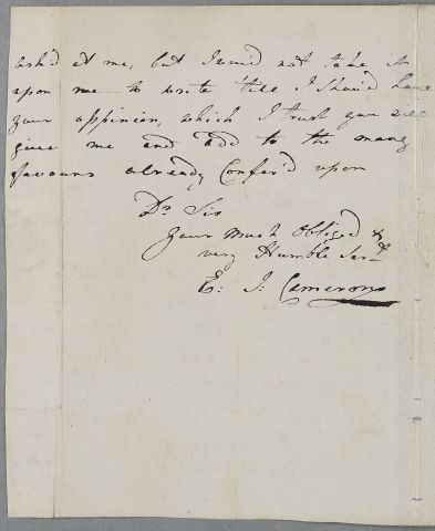 | Summary | Letter from E. J. Cameron, concerning the case of her husband, Captain Cameron who has had a palsy (stroke), but 'calls for Port [wine]'. Some phonetic spelling throughout. Cullen's brief response is recorded on the reverse. |