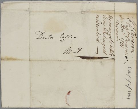 Letter from E. J. Cameron, concerning the case of her husband, Captain Cameron who has had a palsy (stroke), but 'calls for Port [wine]'. Some phonetic spelling throughout. Cullen's brief response is recorded on the reverse.