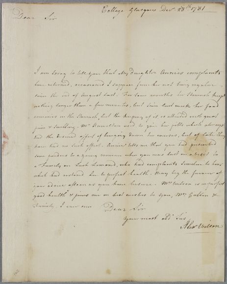 | Summary | Letter from Prof Alexander Wilson at Glasgow College (University), concerning his daughter Annie who has menstrual problems, but she has heard that Cullen helped such a case when he last visited Loch Lomond. A note on the reverse states that the answer was not copied. |