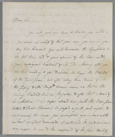 Letter from Alexander Bertram, concerning the case of an unnamed male patient. A note on the reverse states that the answer was not copied, but suggests treatment.