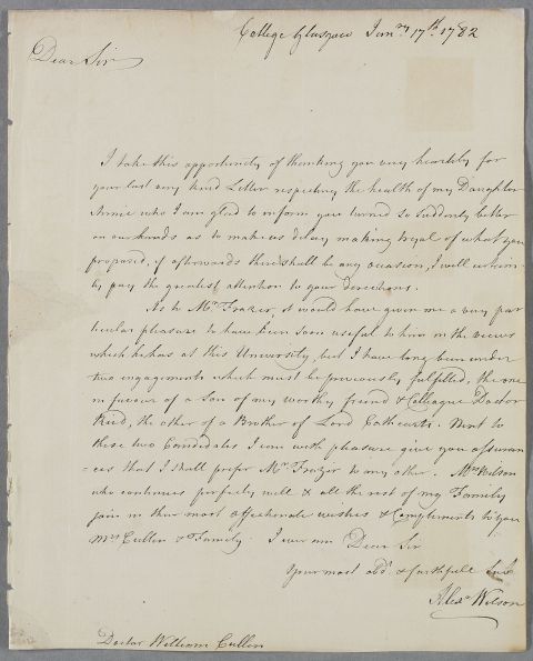 | Summary | Letter from Alexander Wilson, concerning the case of his daughter Annie and of Mr Frazer; mentions Glasgow College colleagues including the philosopher, Prof. Thomas Reid. |