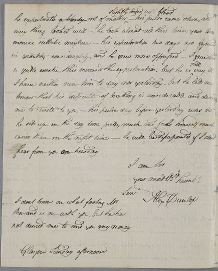 Letter from Alexander Dunlop, concerning the case of John Rowand, whose latest 'asthmatic fit' turned out to have 'all the symtoms of Peripneumony'. He was coughing bloody matter. Dunlop has been bleeding him, and he has been taking 'your Ammoniac scillitic mixture'. A recipe is writen on the reverse, presumably copied from Cullen's reply.