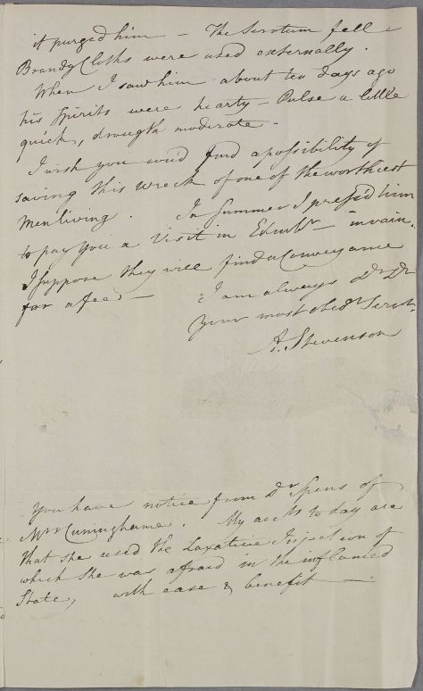 [ID:2147] From: Dr Alexander Stevenson (Professor; of Dalgairn ) / To: Dr William Cullen (Professor Cullen) / Regarding: Reverend James Hamilton (of Paisley) (Patient), Mrs Cuninghame (Patient) / 8 February 1782 / (Incoming)