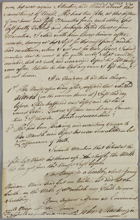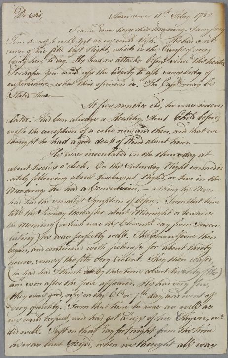 | Summary | Letter from John McKenzie, possibly to his brother-in-law Thomas Naismith, concerning his six-month-old son. The child has become ill after being inocculated with smallpox. Destination of letter inferred from related documents. |