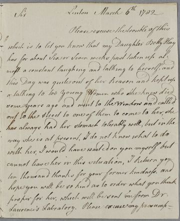 | Summary | Letter from Charles Hay, concerning the case of his daughter Betty. Addressed to 'Dr J Cullen'. Place of writing is 'Linton' but not connected as place because there are several and it is not clear in which one Hay lived. |