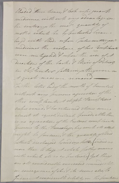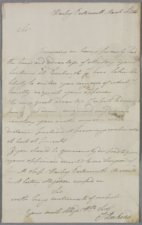 | Summary | Letter from T. Kinkead, a former student of Cullen's, concerning his own case. Consists of a covering letter and a lengthier case note, written in the third person. Kinkead is a surgeon on a ship, docked in Portsmouth, from which the letter seems to have been sent - external evidence suggests this was probably HMS Harpy. |