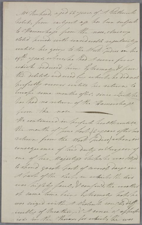 Case of T. Kinkead, ship's surgeon and Cullen's former student, who has often had nose-bleeds and whose health has declined since returning from the West Indies where he had a fever. |