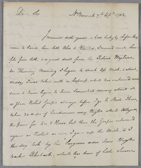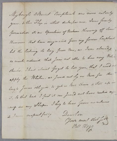 | Summary | Letter from William Hogg, concerning his own case. His cough is much improved, but he is now suffering from gripes and looseness of the bowels. |