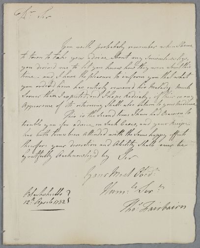 | Summary | Letter from Thomas Fairbairn concerning the case of 'my son-in-law's legs', and thanking Cullen for the cure which has 'entir[e]ly removed his malady'. |