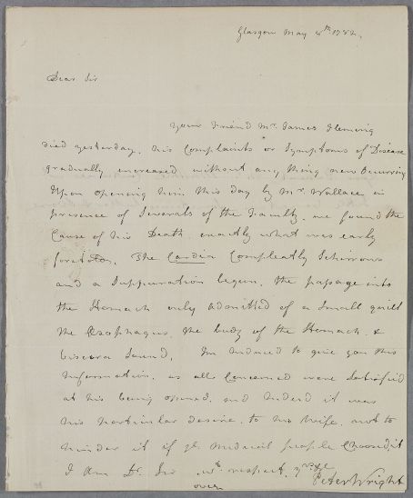 | Summary | Letter from Peter Wright reporting that 'your friend Mr James Fleming died yesterday', and post mortem report on the autopsy carried out 'by Mr Wallace in presence of several of the Faculty'. He adds a brief note on Mr Matthie. |