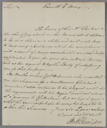 | Summary | Letter from Anthony Harrison, concerning the case of Mrs Parker and reporting on the progress of Harrison's brother-in-law Colonel Robinson, 'who consulted you last summer for a troublesome flatulant complaint'. |