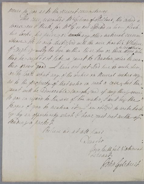 Letter from John Gilchrist, concerning the cases of Mrs Gordon of Greenlaw, who 'passed through here in her way to Edin[bu]r[gh], accompanying Mr Gordon for the sake of a jaunt', and Mr Gibson of Kelton, whose case hers resembles.
