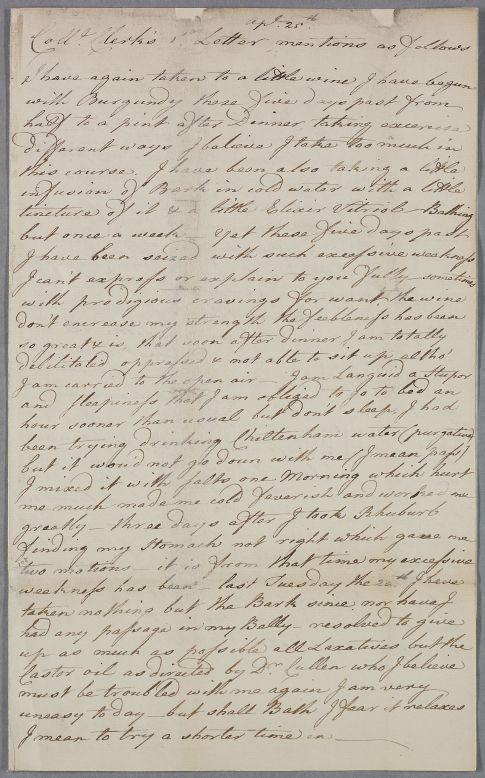 | Summary | Transcription by Robert Clerk of an extract from a letter to him from his brother, Colonel Clerk, concerning the Colonel's own case. Enclosed in letter 2221 along with letter 2220. Colonel Clerk reports on his taking of wine and exercise and the medicines he has used to combat his excessive weakness. |
